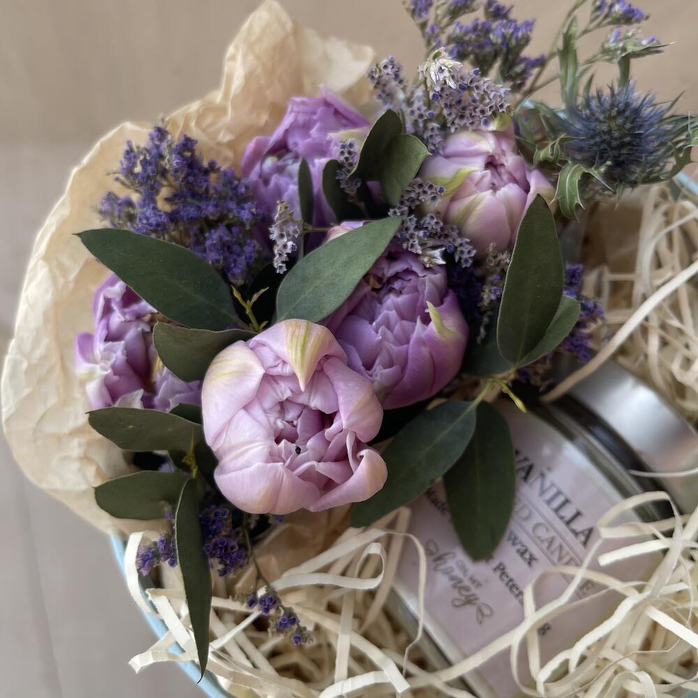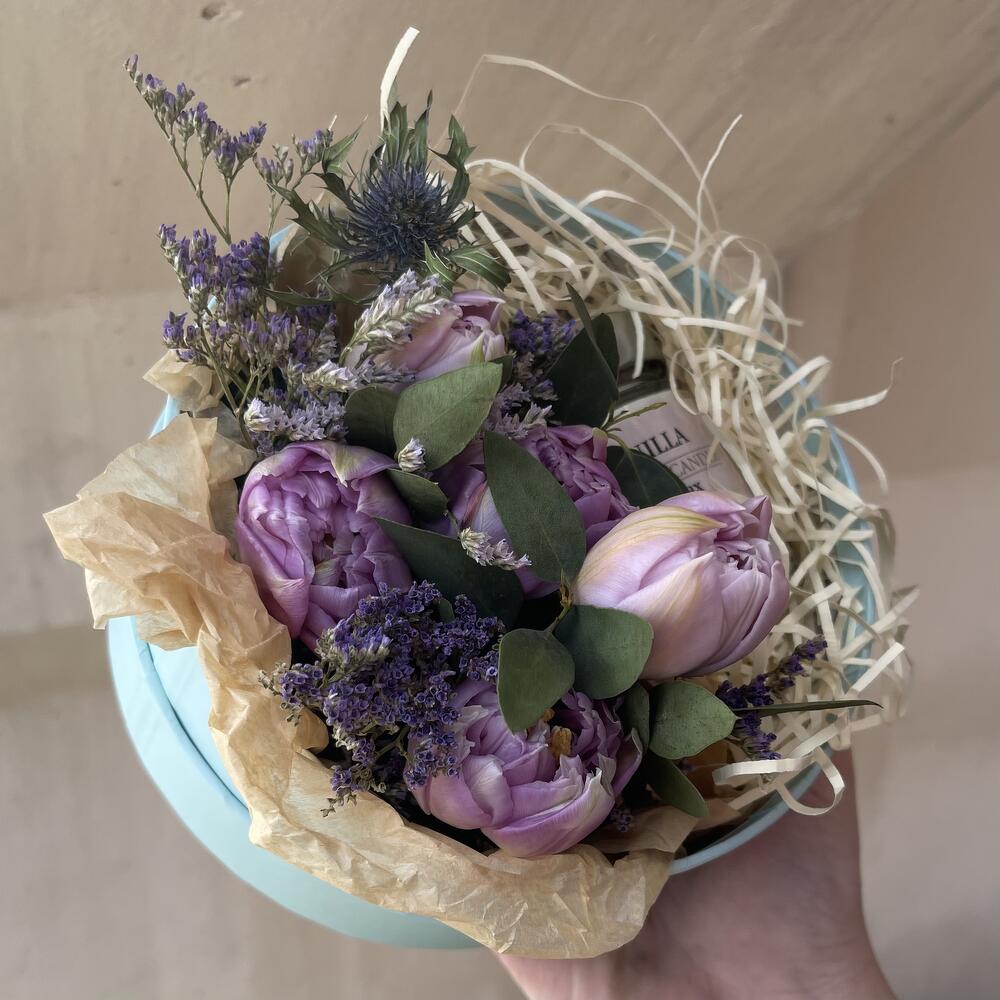 Лимониум – 1 шт.Тюльпан – 5 шт.Эрингиум – 1 шт.Упаковка дизайнерская – 1 шт.Свеча ароматическая – 1 шт.