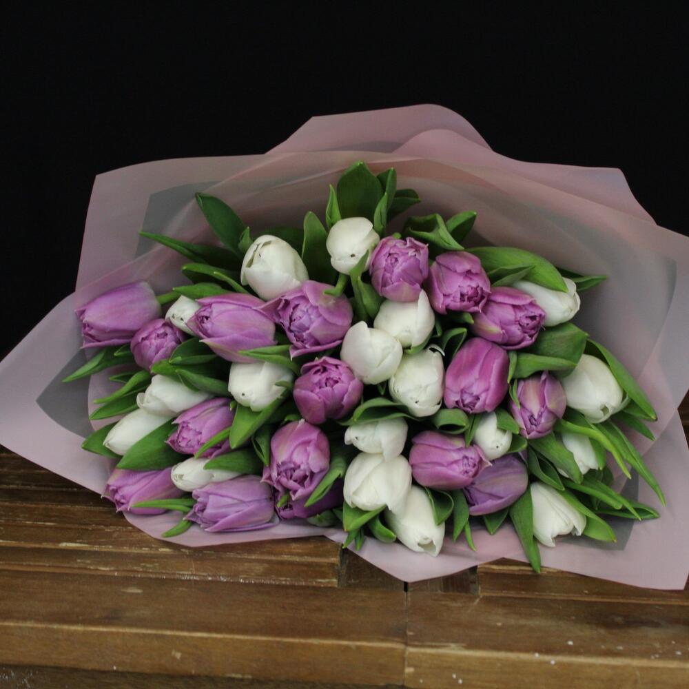 Тюльпан пионовидный – 17 шт.Тюльпан белый – 18 шт.Пленка матовая – 2 шт.Лента атласная – 1 шт.