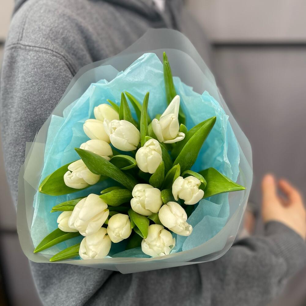 Тюльпан белый – 15 шт.Пленка дизайнерская – 4 шт.Тишью – 2 шт.