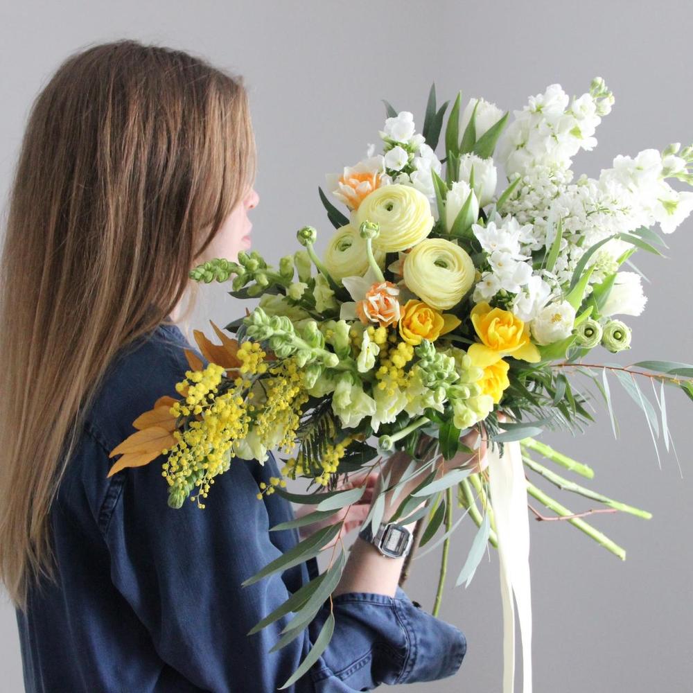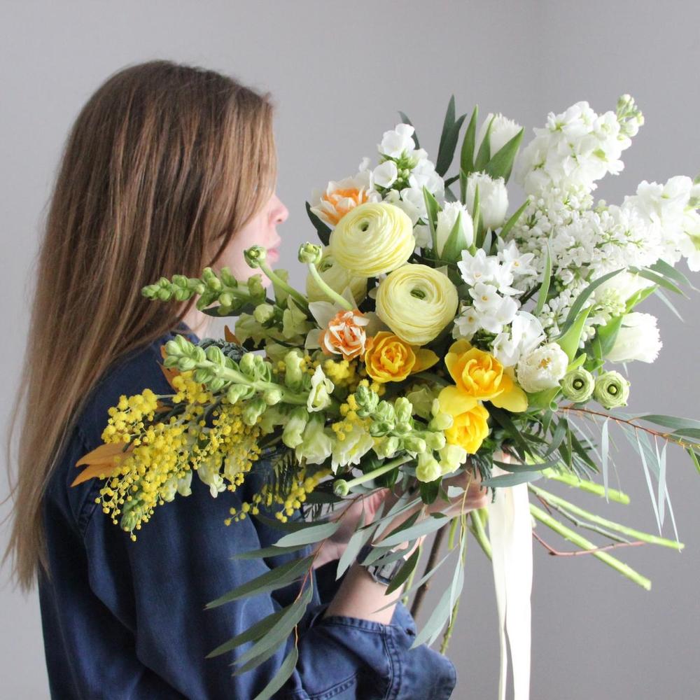 Мимоза – 2 шт.Ранункулюс – 3 шт.Нарцисс – 7 шт.Сирень – 2 шт.Маттиола – 2 шт.Львиный зев – 3 шт.Флокс – 2 шт.Тюльпан – 5 шт.Эвкалипт – 6 шт.Эвкалипт стабилизированный – 1 шт.Лента атласная – 2 шт.