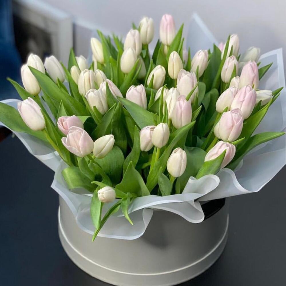 тюльпаны белые – 51 шт.Коробка шляпная – 1 шт.Упаковка дизайнерская – 1 шт.Лента атласная – 1 шт.Открытка – 1 шт.инструкция по уходу за цветами – 1 шт.хорошее настроение – 100 шт.Кризал – 1 шт.