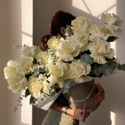 Розы 15 шт с эвкалиптом в тубусе